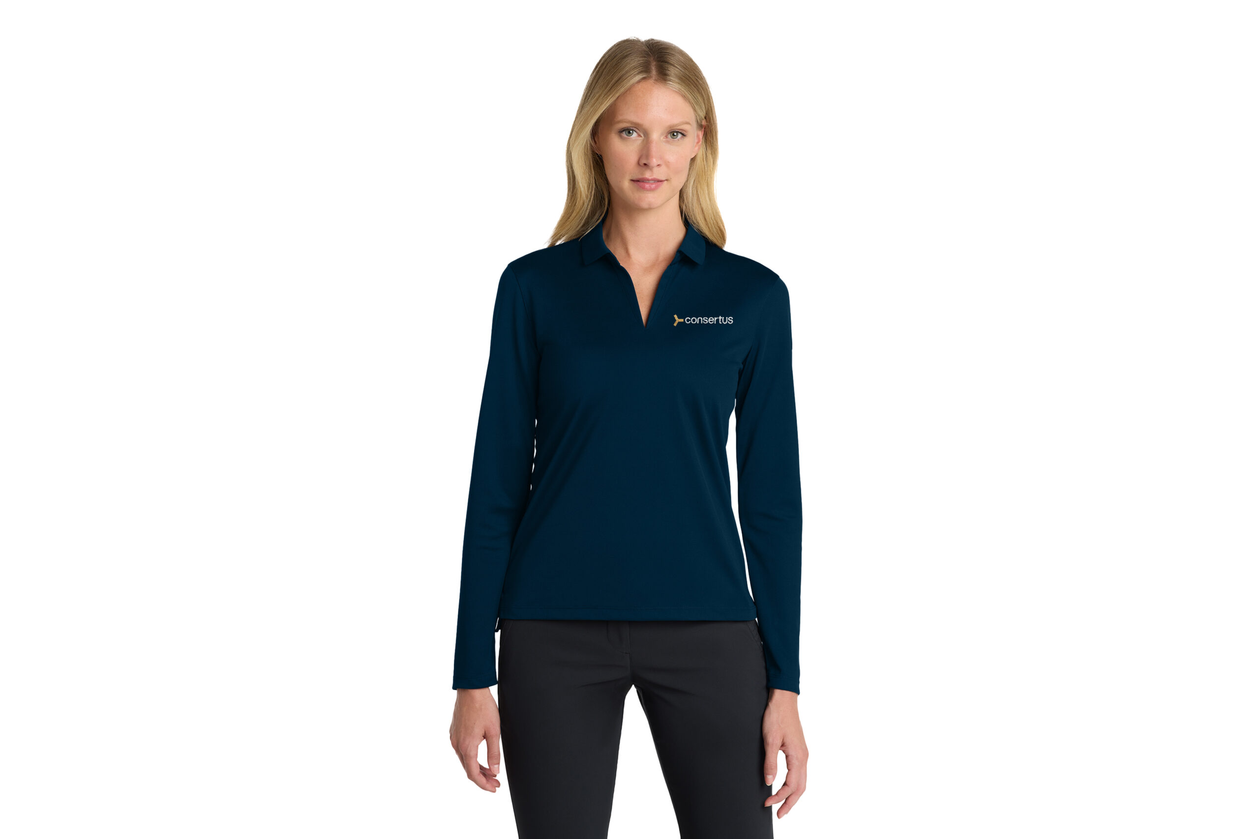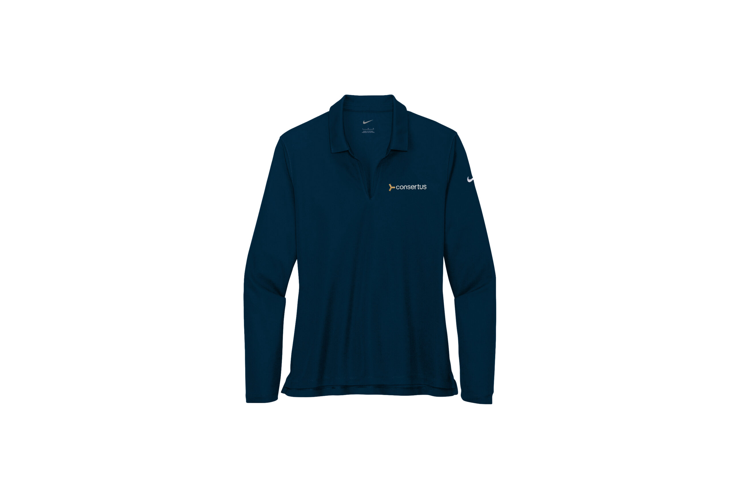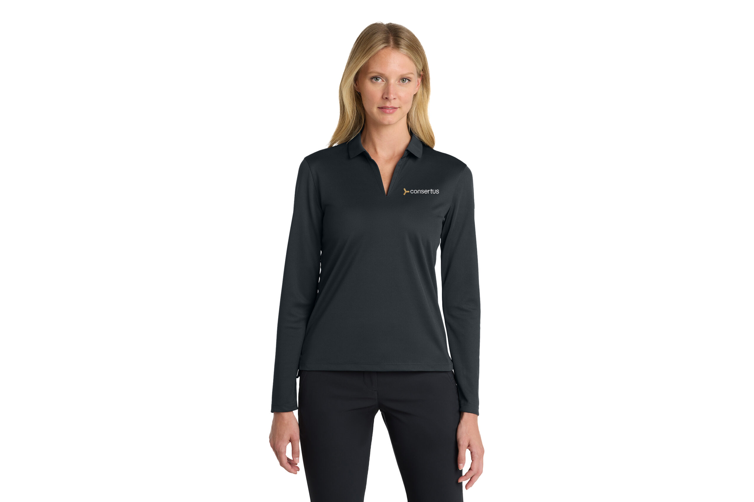 Women love this Nike long-sleeved polo made with a modern twist and Dri-FIT moisture management technology and stretch fabric. This long-sleeved polo is a true performer for her, tailored for a feminine fit with a self-fabric collar, open neckline, longer length, high-low hem, and side vents. Rolled-forward shoulder seams, open hem sleeves, and open hem. The contrast Swoosh logo is embroidered on the left sleeve, the Consertus Logo is embroidered on the left chest. Made of 4.3-ounce, 100% polyester Dri-FIT fabric.